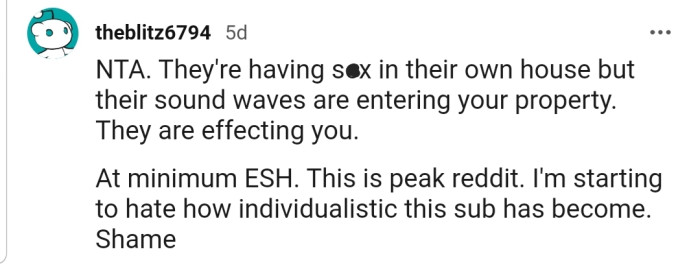 "NTA. They're having sex in their own house, but their sound waves are entering your property."