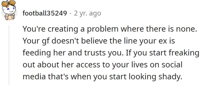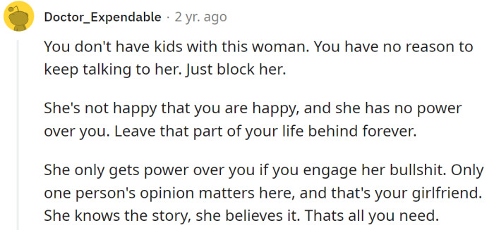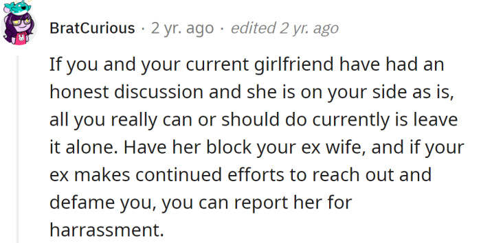 Redditors told the OP that the best option is to ignore his ex-wife. The most important thing is that his girlfriend believes him, so his ex-wife can't harm him anymore.