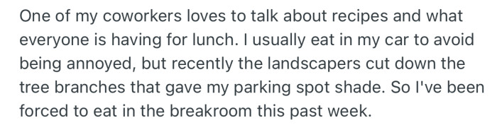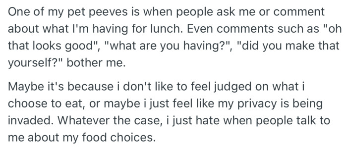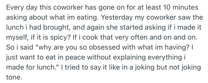 From the outside, the comments sounded harmless. “It looks good,” “food is relatable,” and “just eat somewhere else” were all thrown into the mix. But the repetition made it feel less like friendly conversation and more like someone hovering over her personal routine, especially when the coworker kept pushing even after it clearly bothered her.
