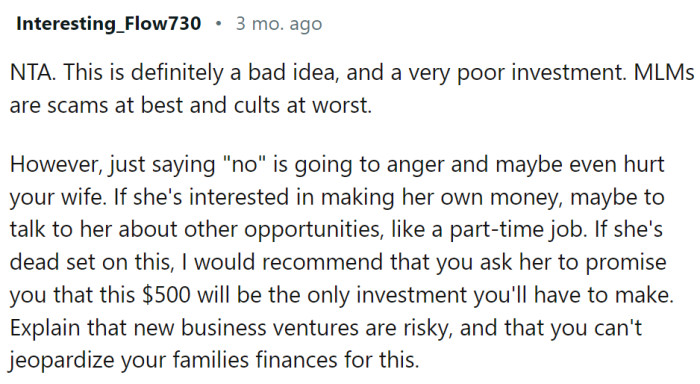 Despite his wife's indignation that he is preventing her from establishing her own income stream, OP clarified that his concerns are specific to the MLM scheme and not about her desire to contribute financially. He is open to her finding a part-time job; it's just that this specific venture appears to be dubious.