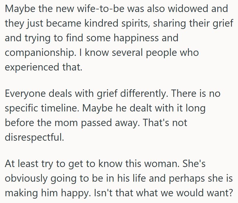 Some commenters, however, suggested that older people often move forward faster, not because they loved less, but because loneliness can be unbearable. Others speculated that the father may have started grieving long before the actual death, especially if his wife had been ill for a long time — something hinted at in follow-up comments.