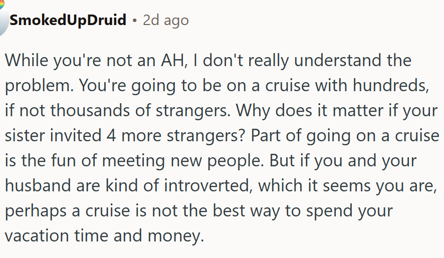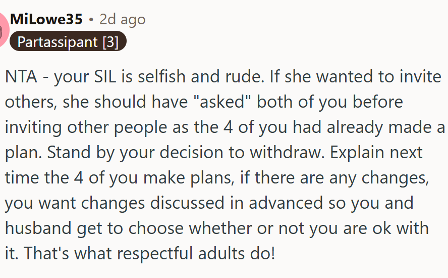 This wasn’t the first time the sister-in-law had unexpectedly invited outsiders to what was supposed to be intimate gatherings, and in the past, the poster and her husband often felt sidelined. Faced with the prospect of spending significant time and money on a trip with strangers, they decided not to go.