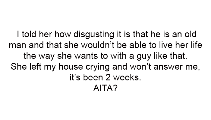 The story highlights a sibling conflict sparked by deep-seated concerns over a significant age difference in a romantic relationship. The older sister’s protective instincts clashed with her younger sister’s excitement, resulting in a painful fallout. Here’s what others think about this situation: