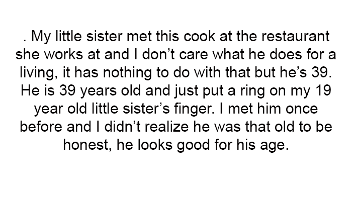 In a heartfelt post, a 28-year-old woman shared her distress over her 19-year-old sister's engagement to a 39-year-old cook. The two sisters have faced life's challenges together after losing their only parent, with the elder sister stepping into a parental role.