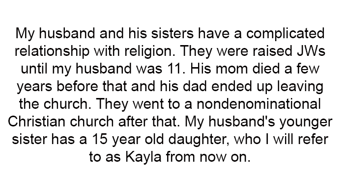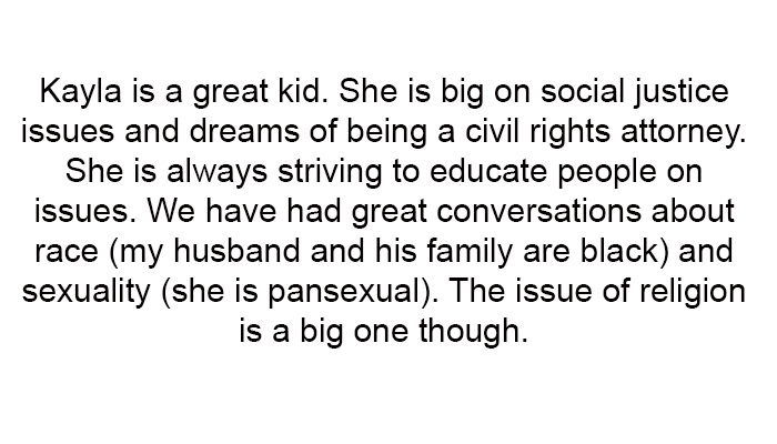 Her husband, who was raised as a Jehovah's Witness but is now agnostic, has a complicated relationship with religion, as does his family. Among the extended family is Kayla, her husband's 15-year-old niece, who is an outspoken atheist and social justice advocate.