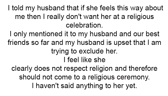 She reasoned that Kayla's lack of respect for religious ceremonies could lead to disruptions during the important event. This caused tension with her husband, who believed that excluding Kayla might be too harsh.