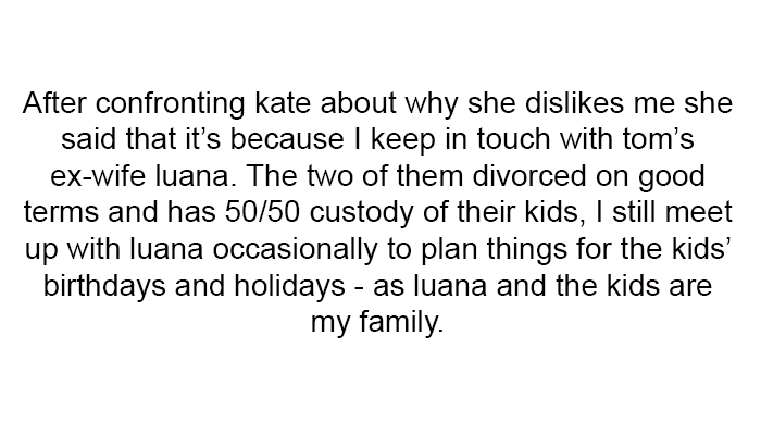 In a dramatic story shared on Reddit, a 28-year-old woman is grappling with a significant family conflict as she plans her wedding. The woman, who has a close relationship with her brother Tom and his children from his first marriage, faces turmoil with Tom's new wife, Kate. Initially happy about their union, she soon discovers that Kate harbors resentment towards her because she maintains a friendship with Tom's ex-wife, Luana. Despite the cordial co-parenting arrangement between Tom and Luana, Kate perceives the ongoing friendship as a threat and attempts to sabotage their relationship.