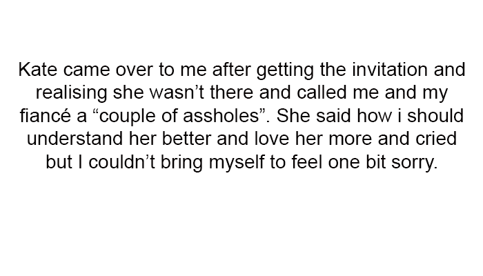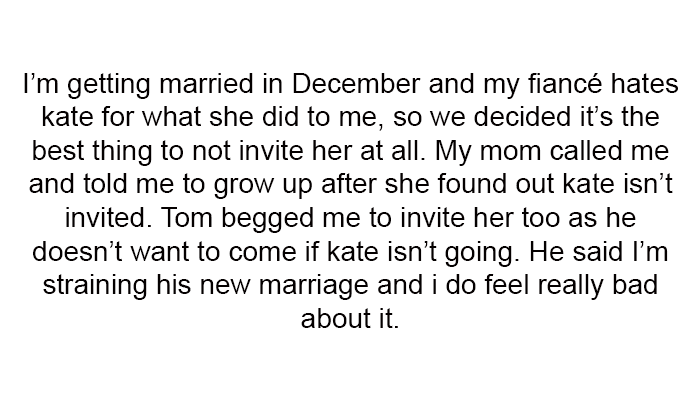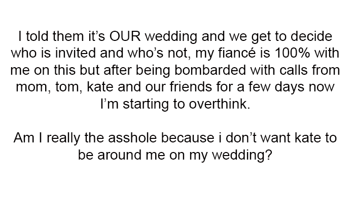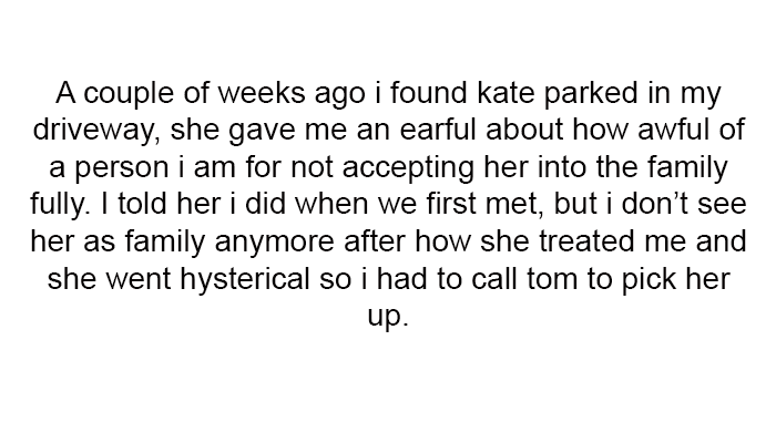 The final straw comes when Kate confronts her in her driveway, accusing her of not fully accepting her into the family. Now, as the woman prepares for her wedding, she and her fiancé decide not to invite Kate, sparking a family-wide controversy.