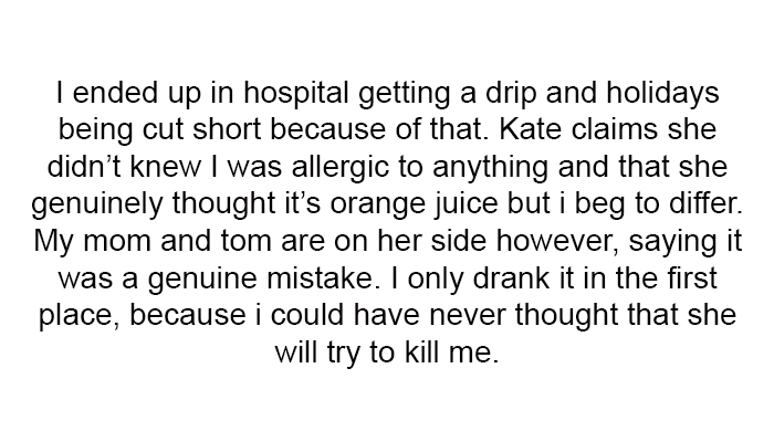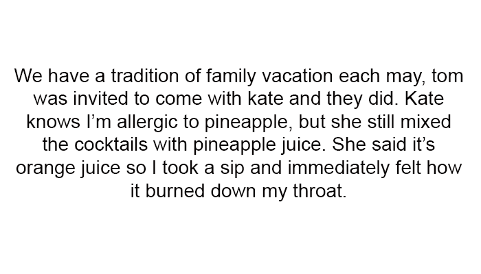 Kate's actions escalate during a family vacation when she serves the woman a cocktail containing pineapple juice, despite knowing about her severe allergy. This leads to a hospital visit and a strained relationship.
