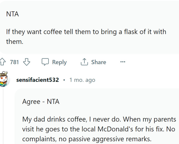 It is essential for both sides to be understanding and adaptable, remembering that the love and connection shared among them is far more important than a morning cup of coffee. While it might be convenient for OP to have a coffee maker at home for guests, it is also crucial for visitors to respect the choices and lifestyle of their host.