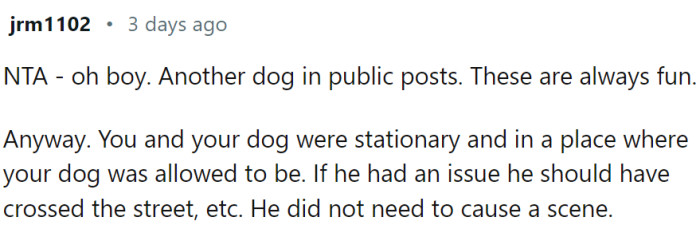 Given the circumstances, it's hard to see how the woman was in the wrong here. She was in a designated dog-friendly area, her dog was under control and close to her, and the man who complained could have easily avoided the situation by giving them a wider berth or crossing the street.