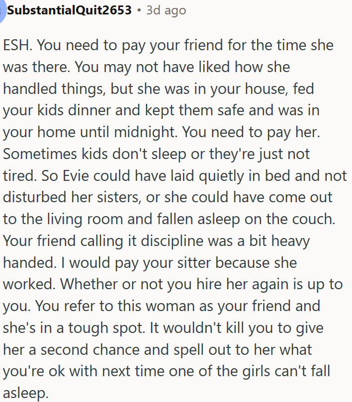 When OP learned what had happened, she decided not to pay for that night and ended the babysitting arrangement. The decision sparked criticism from mutual friends, who argued that the sitter needed the money. OP, however, felt her children’s well-being and trust came first. This story highlights how vital it is for parents to set clear boundaries and ensure caregivers respect them.