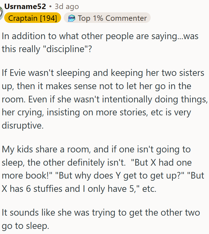 One evening, however, things went wrong. Evie had trouble falling asleep and asked for more stories. Instead of following the agreed-upon routine, the babysitter separated her from her sisters and placed her in the guest room, where she cried for hours until OP returned home.