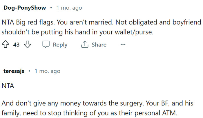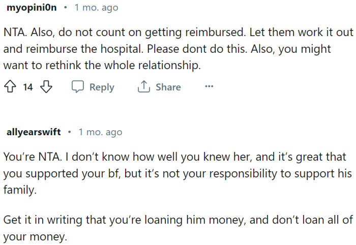 Most Redditors agree with this sentiment, emphasizing that while it's admirable to help a partner in times of need, it should never become an expectation that breeds resentment. OP's boyfriend's disappointment reveals a problematic perspective that, if not addressed, could set a troubling precedent for their relationship going forward.