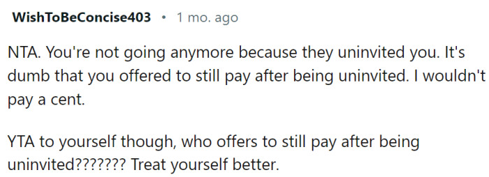 The question is "WIBTA for not paying them money although I initially said so?""It's dumb that you offered to still pay after being uninvited."