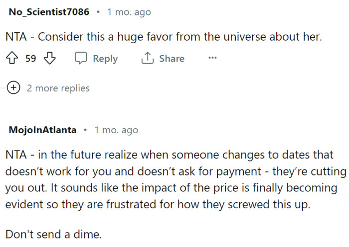 Let's be honest: friendships can get messy, but this situation seems pretty clear-cut. OP tried her best to roll with the punches, from date changes to unclear payment plans. Yet, at every turn, Jane and John made things harder. Bringing up the whole "togetherness" thing feels more like an excuse rather than a real issue. It's almost like they were looking for a way out. In any friendship, being open and straightforward is the way to go. But from the story, it sounds like Jane and John weren't really playing fair. Friendships should be built on trust and understanding, but it looks like that foundation was missing here.