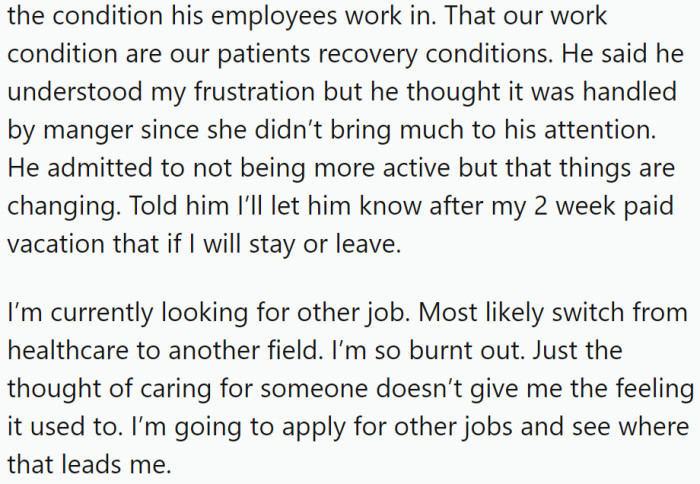Due to a shortage of healthcare workers, many employees, including OP, often pick up extra shifts and work overtime. After working 16-hour shifts for eight consecutive days, OP was exhausted and looking forward to a day off.