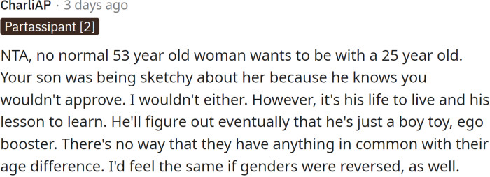 In this case, the father's apprehension about his son's relationship with an older partner may stem from protective instincts. These instincts can be rooted in evolutionary psychology, where parental concern for their offspring's well-being is paramount. The father’s skepticism could reflect fears about potential power imbalances or life stage differences that might affect the relationship's dynamics.