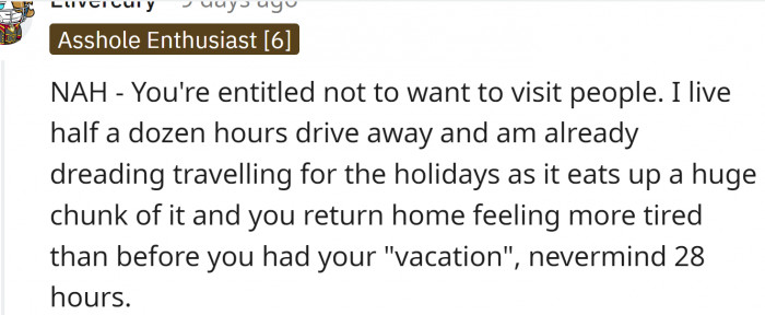 How can we do it without hurting their feelings? One Redditor asked: “WIBTA if I don't travel for the holidays?” OP and their partner have had a very demanding year.