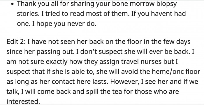 If a doctor warns you about something, you better listen; otherwise, you'll end up like this nurse who learned that lesson the hard way. OP (original poster) is a doctor in the hospital, and he recently had to perform a bone marrow biopsy.