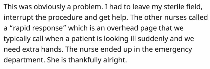 He called her name, but she was unresponsive. He had to interrupt the procedure and leave the sterile field to call for help for the unconscious nurse, who thankfully turned out okay after being treated in the ER.