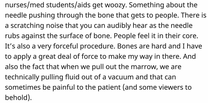 Plus, when they pull out the marrow, they are technically extracting fluid from a vacuum, which can be very painful for the patient and those witnessing the procedure.