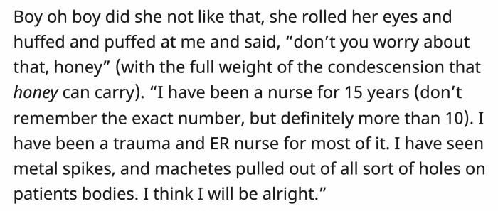 The nurse did not appreciate the warning and rolled her eyes at him. She huffed and said, condescendingly, "Don't you worry about that, honey. I have been a nurse for 15 years."