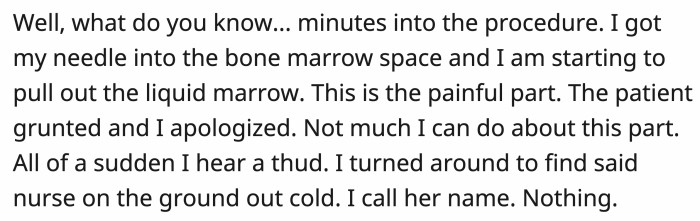 Minutes into the procedure, the patient grunted while OP was starting to extract the liquid marrow. In the background, OP heard a thud and found the nurse cold on the floor.