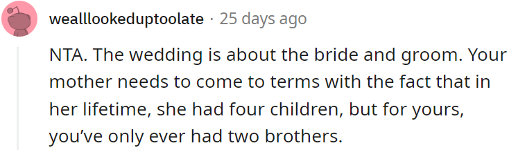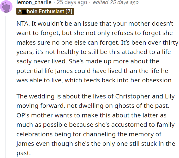 As OP’s eldest sibling, Christopher, geared up for his impending nuptials, he and his bride-to-be decided to draw the line. They assured OP’s parents that they could include James as an “in memoriam,” but the picture was a hard pass—no detailed, heartfelt essay either.