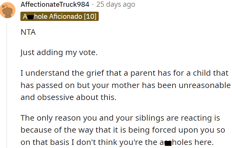 In the eyes of Reddit, OP was spot-on in his delivery. Losing James was tragic, but clinging to his memory in this way isn't healthy.