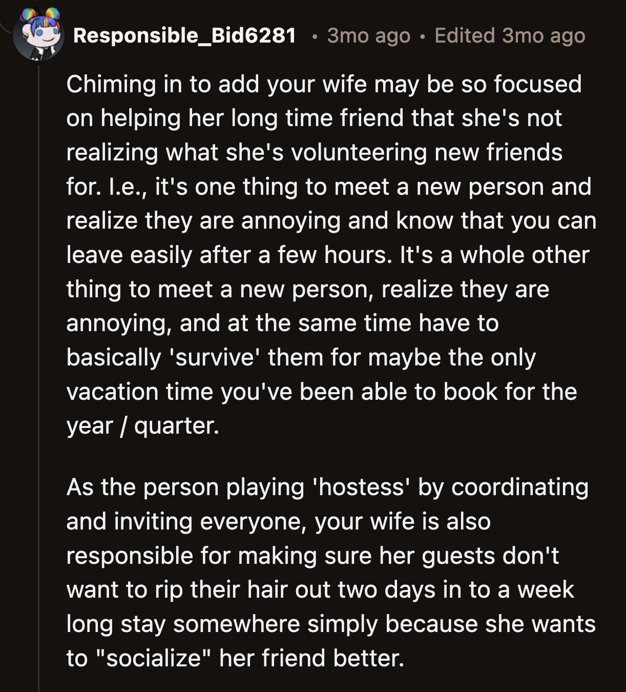 With the trip only weeks away, OP told his wife the truth. Laura said it was unfair to uninvite her friend because OP found her annoying.