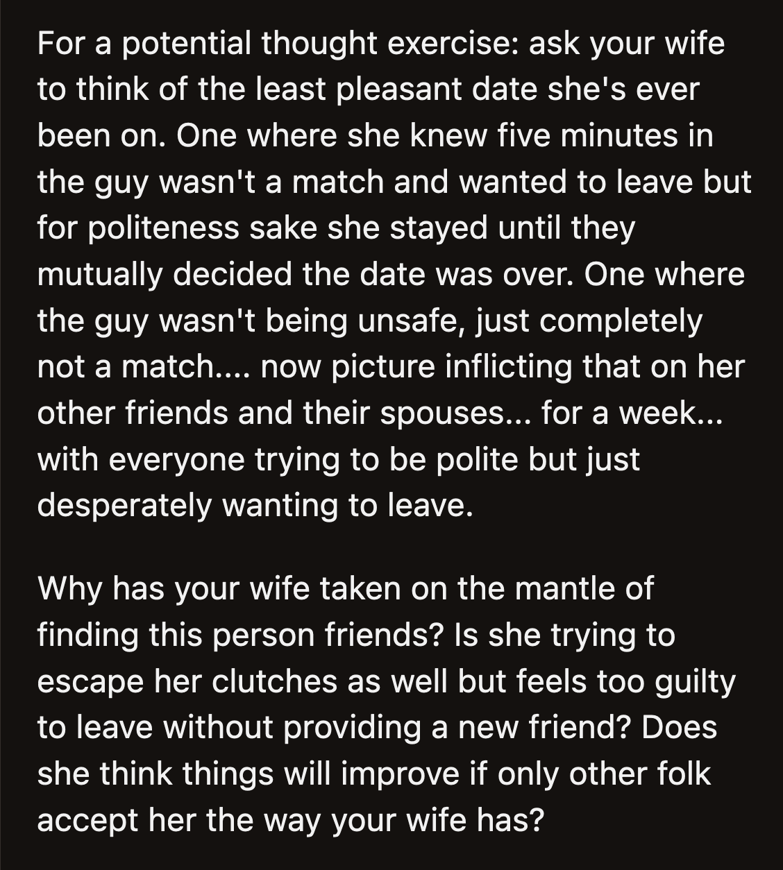 OP's wife means to do well by Dana, but her other friends and her husband shouldn't have to endure a week with someone they don't like.