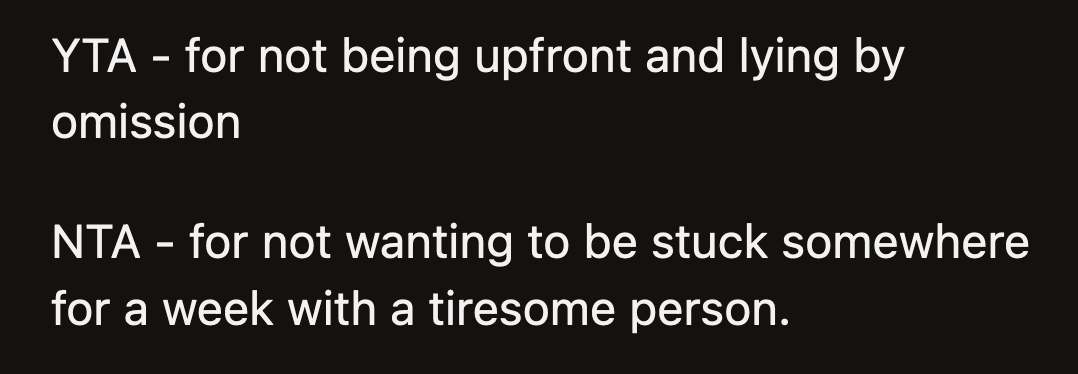 ThrowawayBad1240OP and his wife didn't resolve anything that night. He continued planning their trip and answered evasively when his wife asked about Dana's invitation.