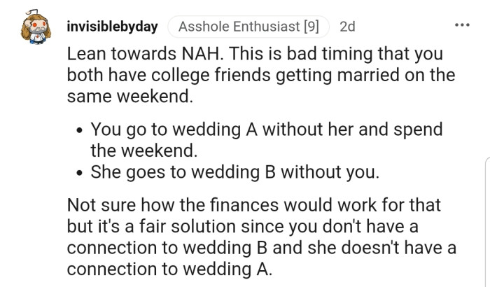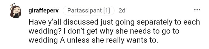 "I don’t get why she needs to go to wedding A unless she really wants to."