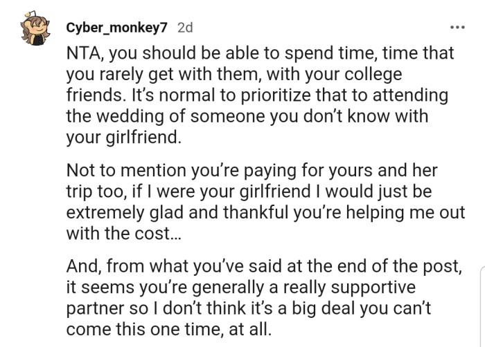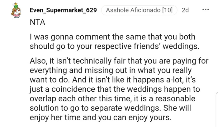 They also believe the time OP’s girlfriend had planned for them to spend at both weddings is unevenly distributed, such that OP has less time to spend with his friends than his girlfriend has to spend with hers.
