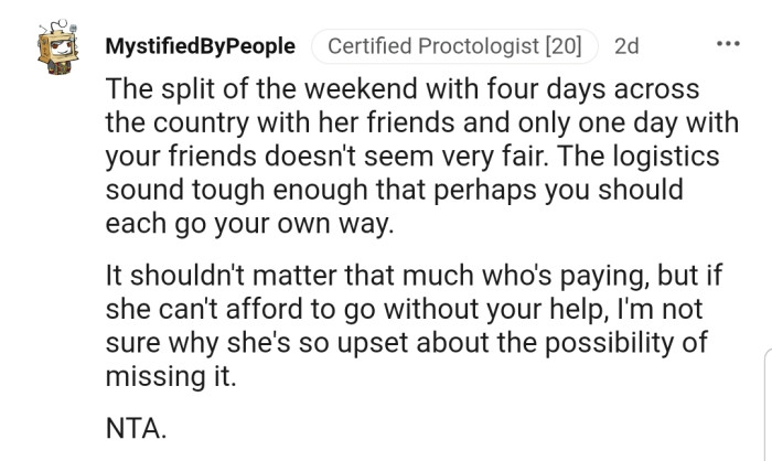 "It shouldn't matter that much who's paying, but if she can't afford to go without your help, I'm not sure why she's so upset about the possibility of missing it."