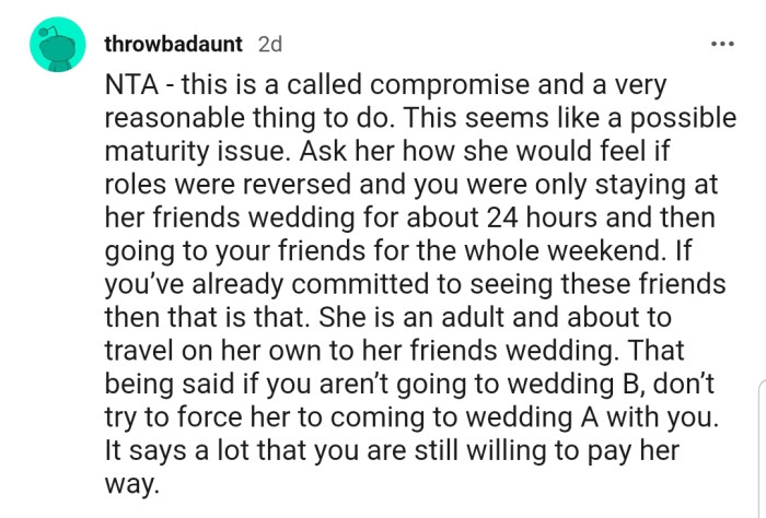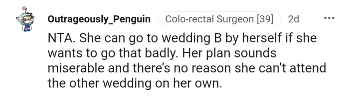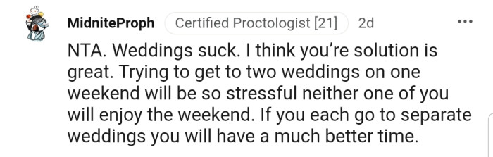 "Her plan sounds miserable, and there’s no reason she can’t attend the other wedding on her own."