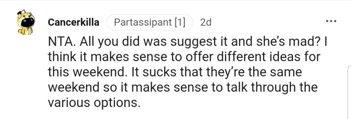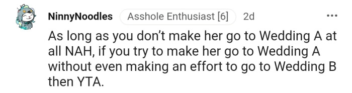 "As long as you don’t make her go to Wedding A at all, NAH."