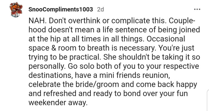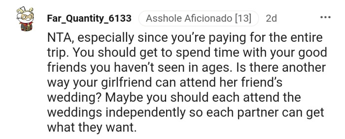 Reddit.comThe problem is, OP is planning to use this opportunity to have a weekend off with his other friends who will be attending the wedding. This means not following his girlfriend to the second wedding.