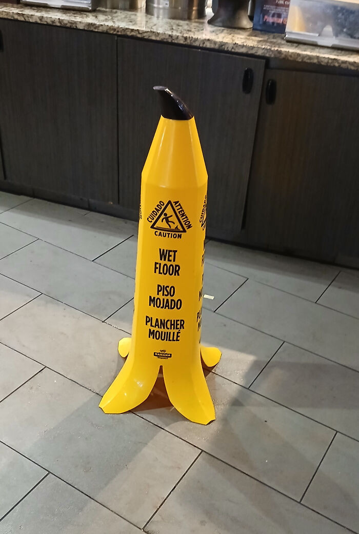 "This Wet Floor Sign Shaped Like A Banana Peel At The Local Movie Theater"