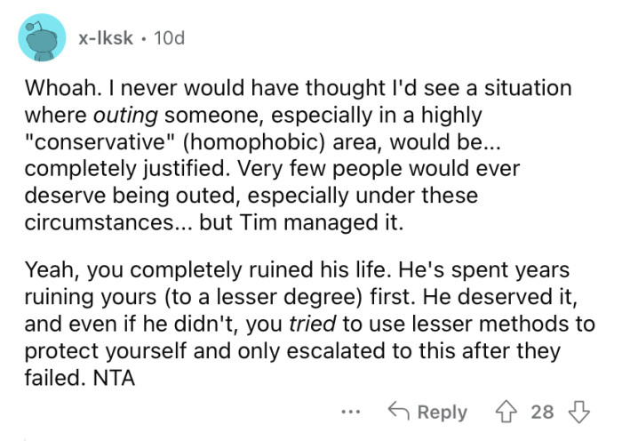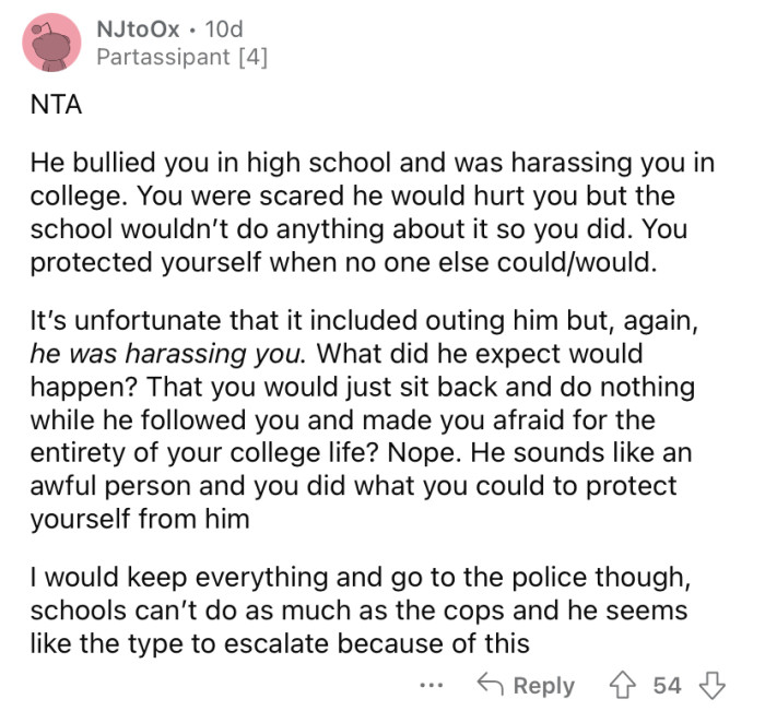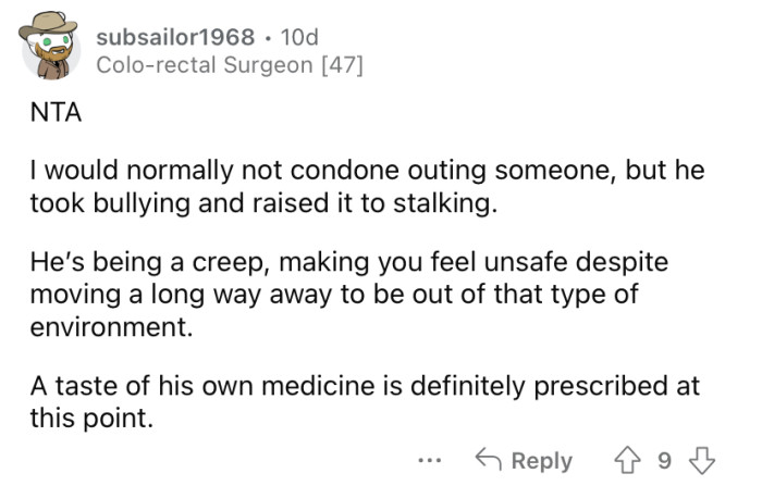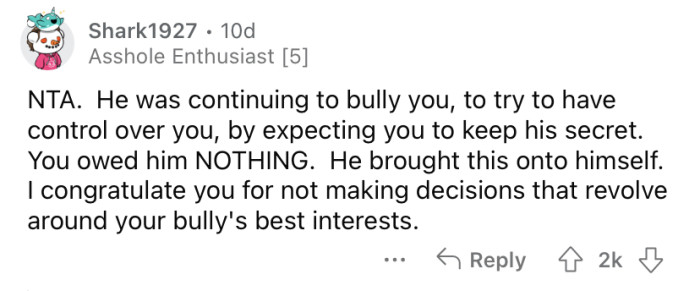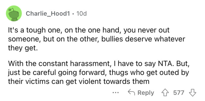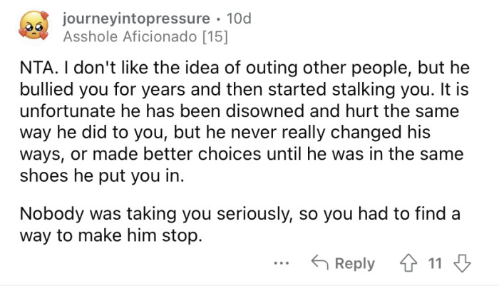 What's your take on this situation? Do you think the OP was too harsh for outing the bully, or did the bully get what he deserved for all the torment he caused the OP?