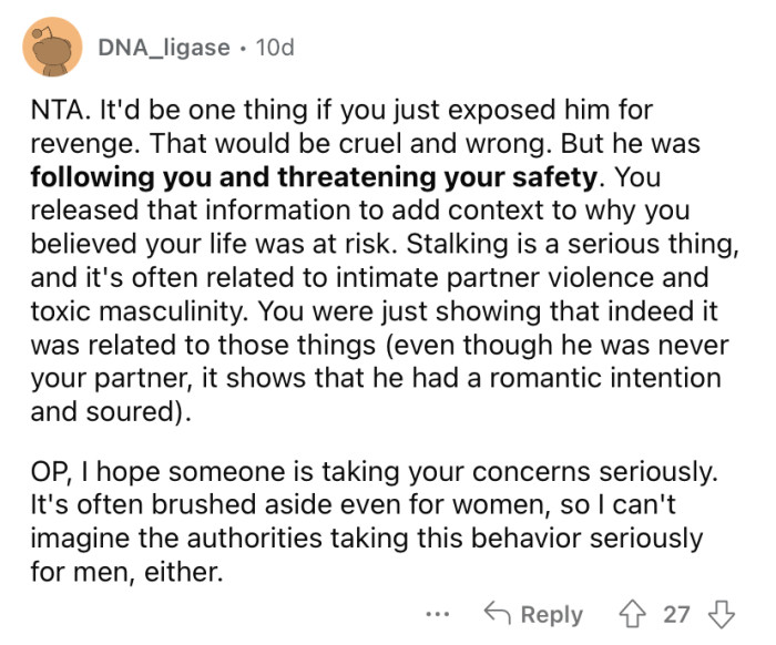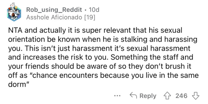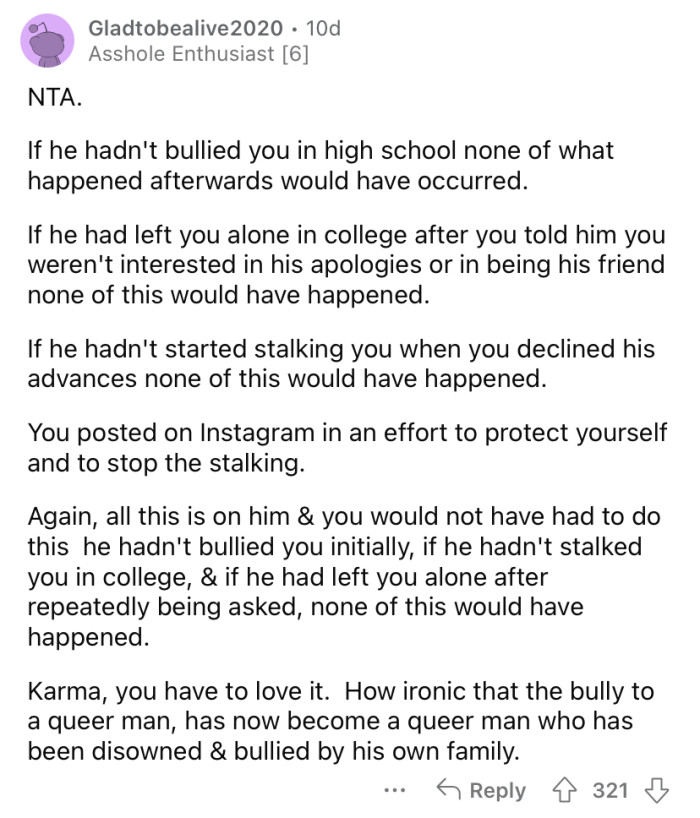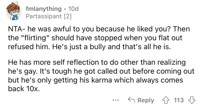 He seemed to be following the Redditor and even admitted that he had realized he was not straight and had bullied the OP because "he liked him."