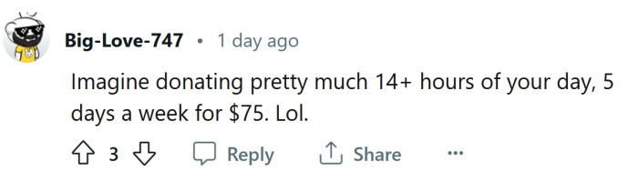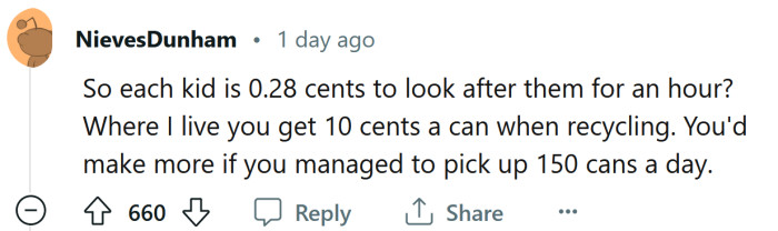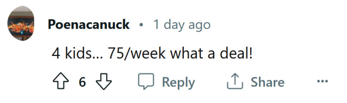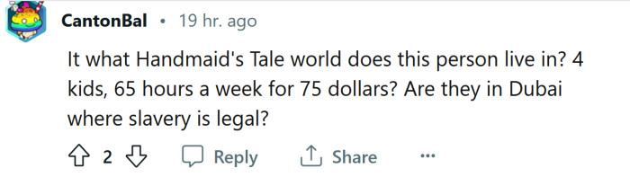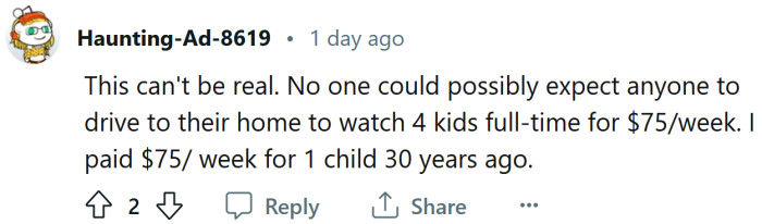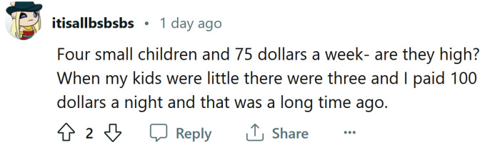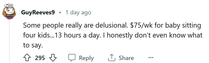 So, what does this incredible babysitter get in return for meeting such high standards? They get the privilege of caring for four little boys aged five and under for 65 hours weekly in exchange for a salary of $75 per week.