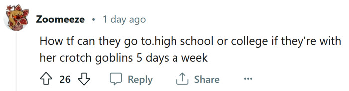 "How can they go to high school or college if they're with her crotch goblins five days a week?"