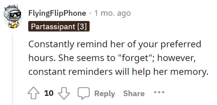 Is the employee the one who must compromise and accept that she has no say in the matter, or is it the manager who needs to be reminded of the arrangement she actually agreed to? This is the dilemma a Redditor wants answers for—is she an asshole for not wanting to work outside her written schedule?