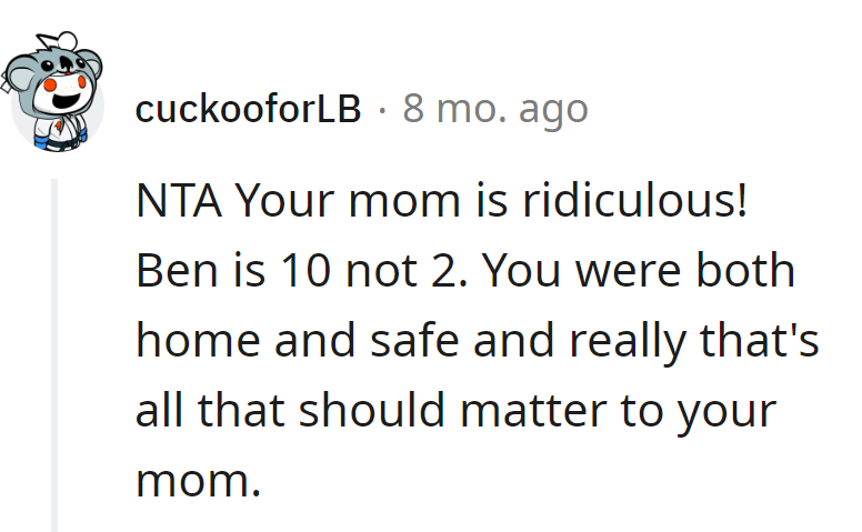 RedditThe siblings avoid mom's overprotectiveness by doing their own thing until just before her return, ensuring the 10-year-old's safety.