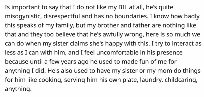 OP says she is uncomfortable around her BIL because he used to make fun of her a lot. He also orders his wife, OP's sister, and OP's mom around by making them prepare his food, wash his clothes, and do all of the childcare.