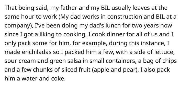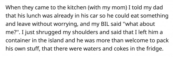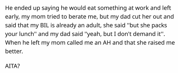 Finally, the defeated BIL surrendered and just said he would buy lunch from outside. OP's mom was not ready to let the issue go, and when OP's dad defended her again, the mom tried to reason that it was unfair because OP packs his lunches for him.
