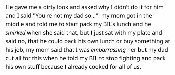 The mom said OP was embarrassing her, but OP's dad defended her. He told BIL to stop arguing and just pack his own lunch because OP already cooked for them.