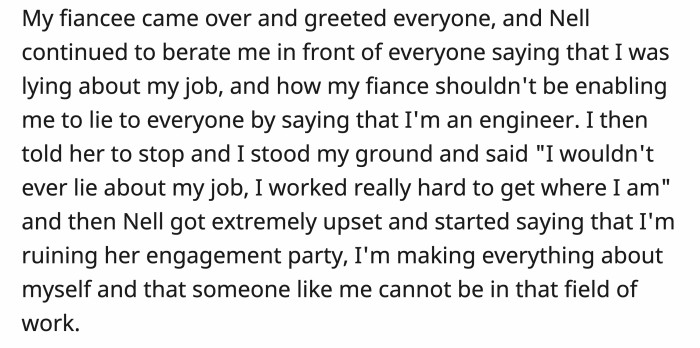 OP's fiancé came over and greeted everyone while Nell continued her odd accusations. She was telling everyone that OP was lying about her job as a software engineer and that her fiancé should stop enabling her lies.